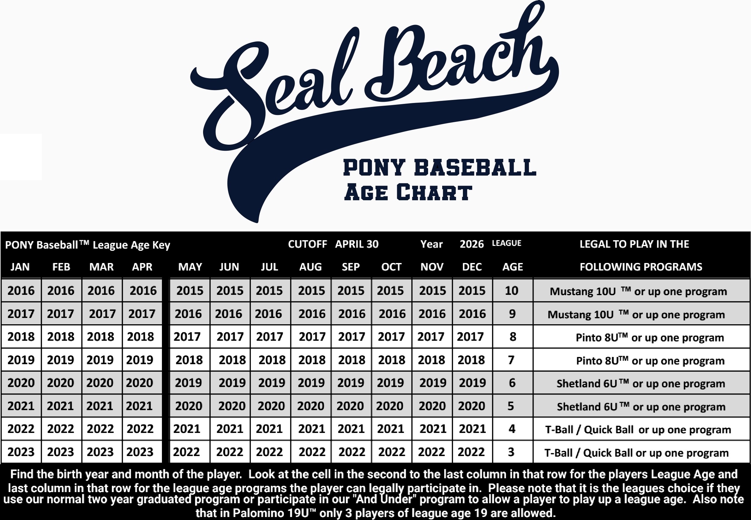 SEAL BEACH PONY BASEBALL is for players between the ages of 3 and 11 years old (birth-dates between 5/1/2015 and 1/1/2023). Please e-mail registration@sbpony.com if you have any questions about age requirements.